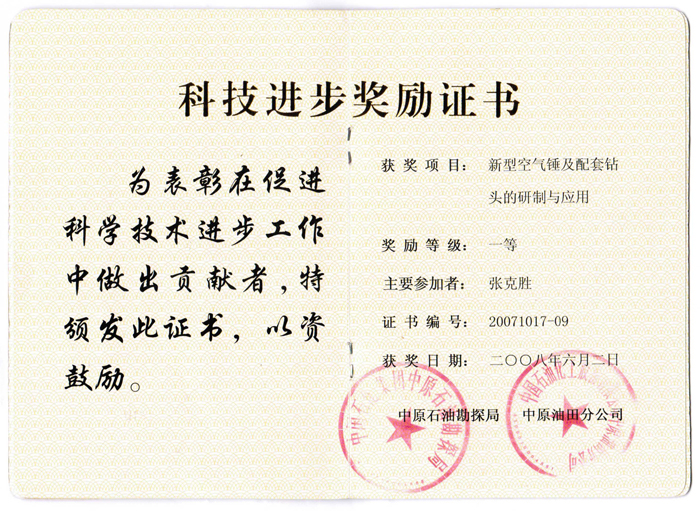 • 空氣錘獲獎證書